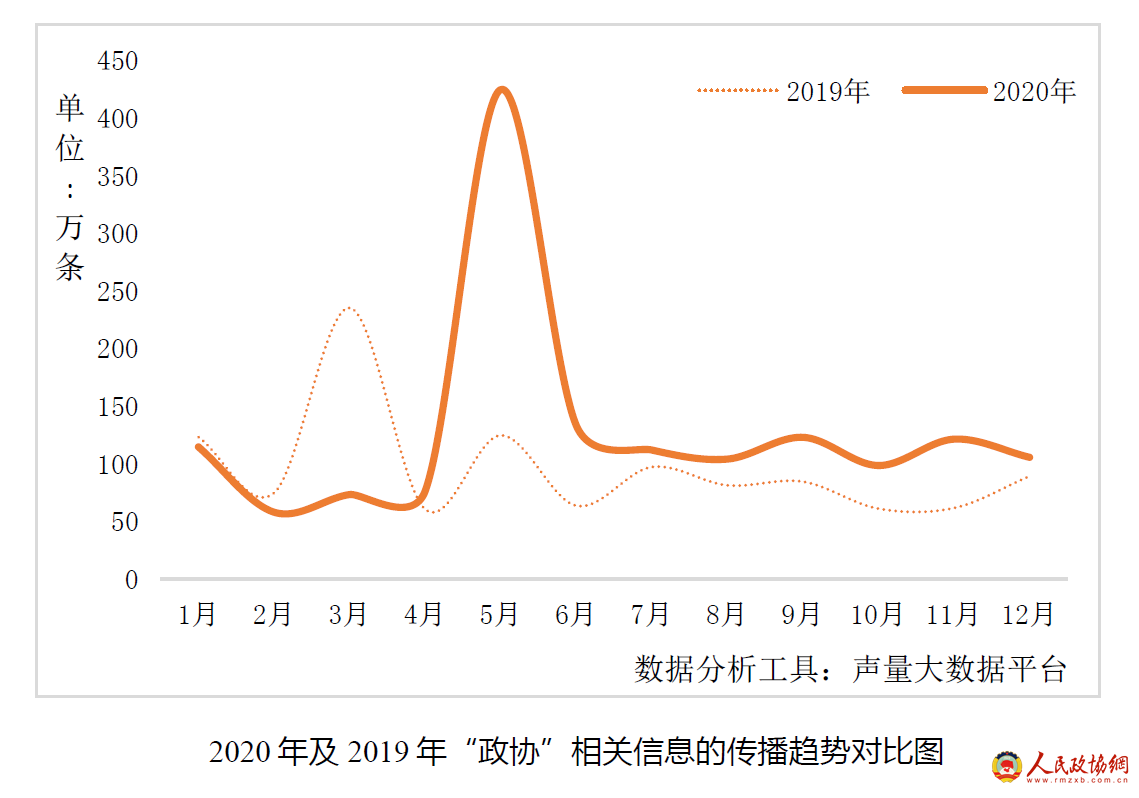《报告》显示,2020年,全网有关“政协”的相关信息约有1543.29万条,其中,网民讨论约743.26万条、媒体报道约800.03万条,信息量走势在全国两会期间达到最高点。