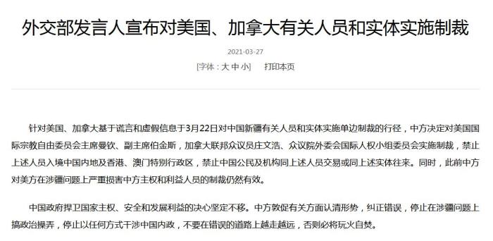 中新网3月27日电 据外交部网站消息,针对美国、加拿大基于谎言和虚假信息于3月22日对中国新疆有关人员和实体实施单边制裁的行径,中方决定对美国国际宗教自由委员会主席曼钦、副主席伯金斯,加拿大联邦众议员庄文浩、众议院外委会国际人权小组委员会实施制裁,禁止上述人员入境中国内地及香港、澳门特别行政区,禁止中国公民及机构同上述人员交易或同上述实体往来。同时,此前中方对美方在涉疆问题上严重损害中方主权和利益人员的制裁仍然有效。