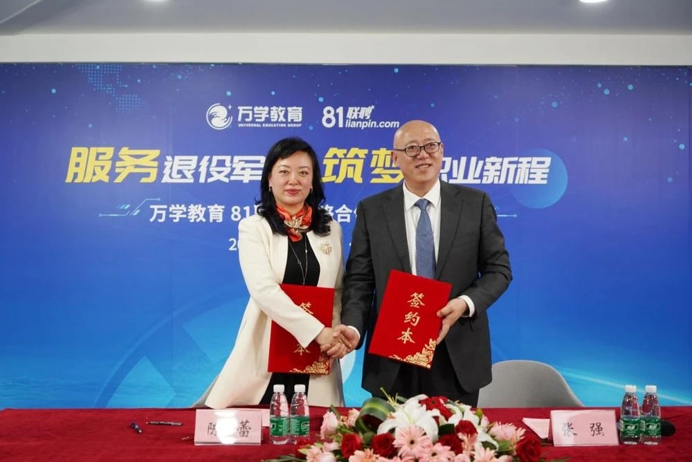 当天,万学教育执行总裁张强与81联聘董事长陈蕾进行签约。