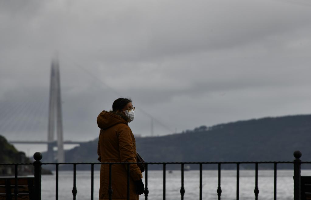 4月5日,一名行人在土耳其伊斯坦布尔的海边行走。(新华社记者徐速绘摄)