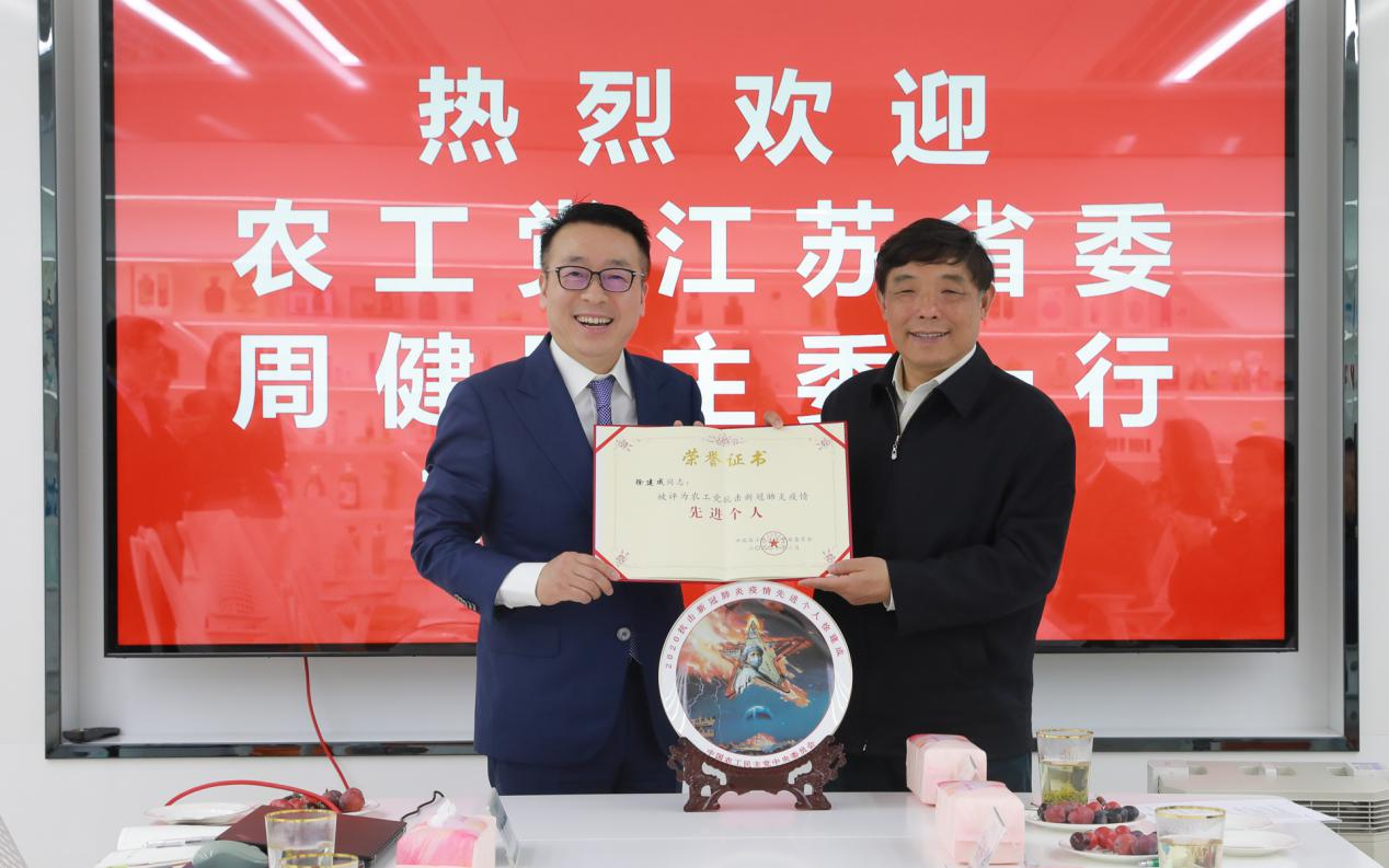 4月12日,江苏省政协副主席、农工党江苏省委主委周健民率调研组一行,赴农工党党员企业绿叶科技集团走访调研并开展座谈会。农工党中央生态环境委员会副主任、绿叶科技集团董事长徐建成率企业相关负责人陪同调研座谈?;嵘希轿破笠荡葱伦?、品牌文化、社会责任等方面展开了深入的交流。因抗击疫情做出的贡献,农工党中央授予徐建成“农工党抗击新冠肺炎疫情先进个人”称号。