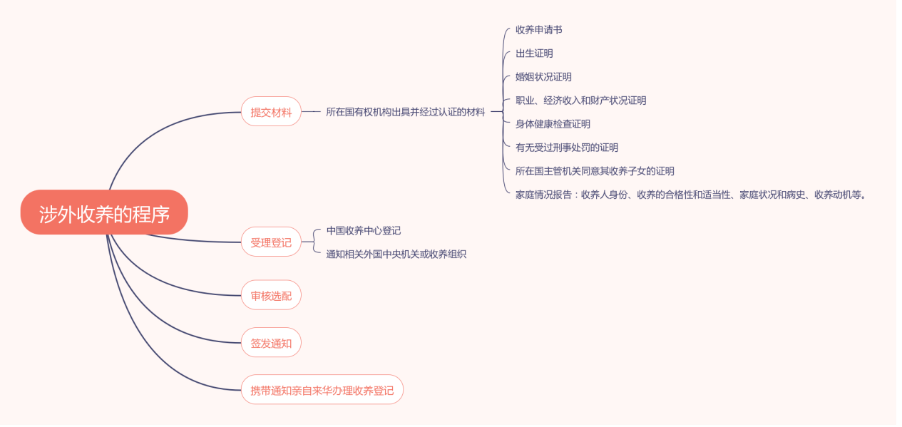 民法典第1109条专门对外国人在中华人民共和国收养子女作了规定,司法部、民政部联合发布了外国人在中华人民共和国收养子女实施办法。我国对涉外收养的要求比国内公民收养更为复杂,目的是为了保障被收养儿童的合法权益。涉外收养的具体程序如图所示。