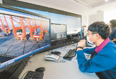 工作人员在河北唐山港智慧码头控制中心进行远程操控作业。