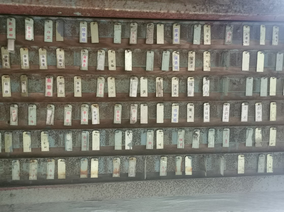 在基地总装厂房门前,两块铁皮箱格外引人注意。箱子内部挂满了含有当年员工名字的铁片,铁片两面的字样颜色分别为“红色”和“黑色”。航天江南党委工作部副部长李德文告诉记者,这里便是当年〇六一基地总装厂员工上班打卡的地方,今天上没上班,就要看员工的牌子翻没翻?!懊刻煸缟嫌泄娑ǖ氖奔淇?,红色代表在上班,黑色代表旷工或迟到?!?/p>