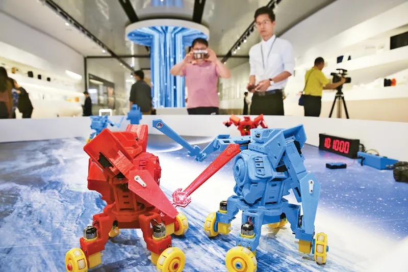 广东坚持把创新发展作为大湾区建设的首要任务,强化三地科技设施联通、科技要素畅通、创新链条融通,大力提升大湾区科技创新实力。图为2021年4月19日,在广东工业设计城创新科技馆,工作人员在展示机器人“速斗无人区”。 新华社记者 殷刚/摄