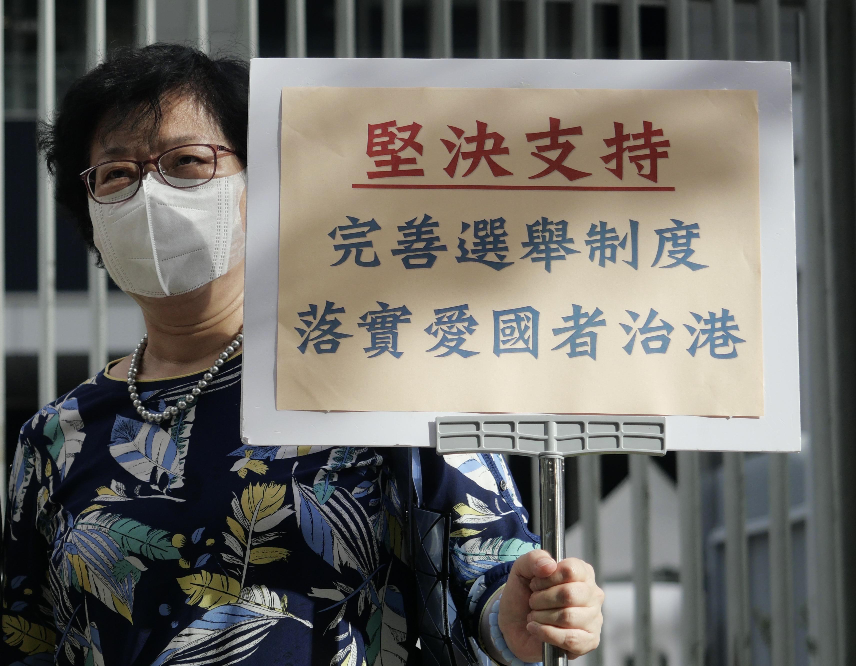 5月27日,在香港特区立法会外,香港市民欢迎条例草案通过。 当日,香港特区立法会三读通过《2021年完善选举制度(综合修订)条例草案》,相关条例将于5月31日刊宪生效。这标志着完善香港特别行政区选举制度的本地立法工作全面完成,是依法治港、拨乱反正的又一重大制度成果。 新华社记者 王申 摄