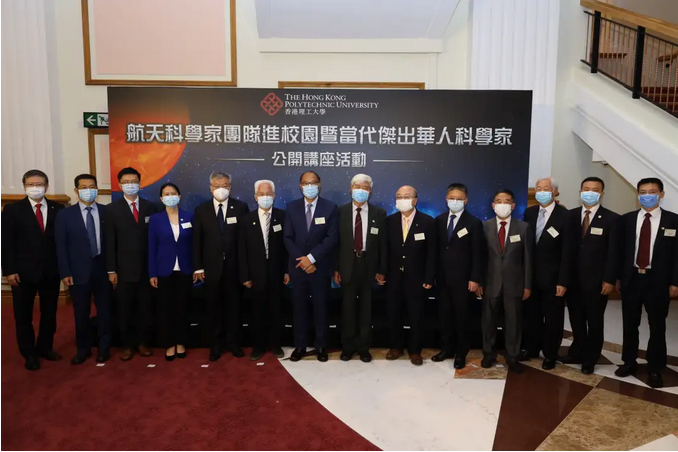 “航天科学家团队进校园暨当代杰出华人科学家公开讲座”活动之首场讲座假香港理工大学赛马会综艺馆举行,访问团中多名航天科学家均有参与,包括探月工程三期总设计师胡浩(右四) ;北斗卫星导航系统工程副总设计师、北斗三号卫星首席总设计师谢军(左五) ;天问一号火星探测器总设计师孙泽洲(右二)及嫦娥四号探测器项目执行总监张熇(左四)。而理大土地测量及地理资讯学系吴波教授(左三)及理大工业及系统工程学系容启亮教授(右六)亦有出席。