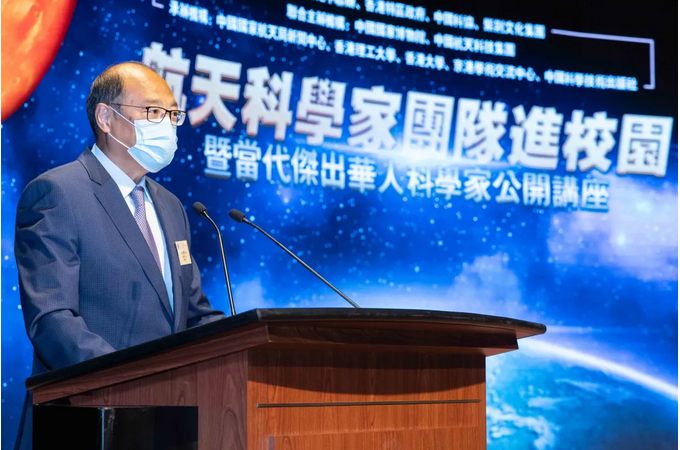理大校董会主席林大辉博士致欢迎辞,感谢各航天专家,让理大师生以及广大香港青少年,得以近距离了解国家航天事业,学习航天精神。