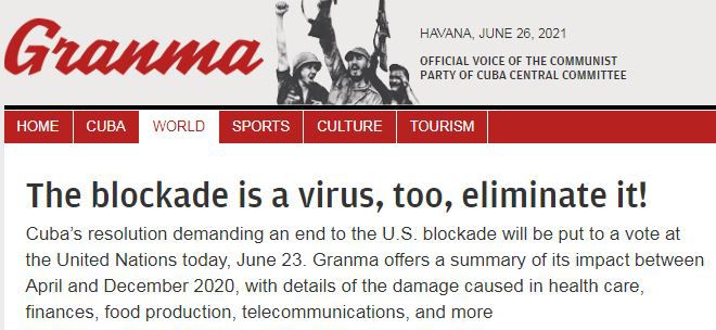 △古巴官方媒体《格拉玛日报》网站当地时间6月23日发表题为《封锁也是病毒,消灭它!》的文章