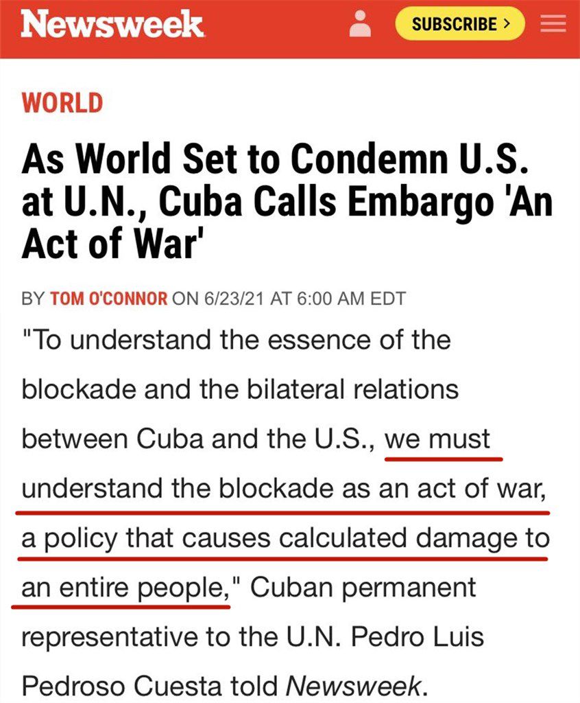 美国《新闻周刊》网站日前也援引古巴常驻联合国代表佩德罗索·奎斯塔的话报道说,“我们必须认识到,这种封锁是一种战争行为,是一项对(古巴)全体国民造成蓄意损害的政策”。