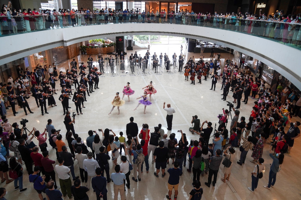“庆七一快闪交响乐”在香港国际金融中心中庭举办,小芭蕾舞者随着《萧斯塔科维奇第二圆舞曲》翩翩起舞