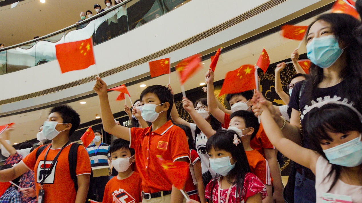 庆七一快闪交响乐活动现场香港儿童挥舞国旗,向祖国致敬