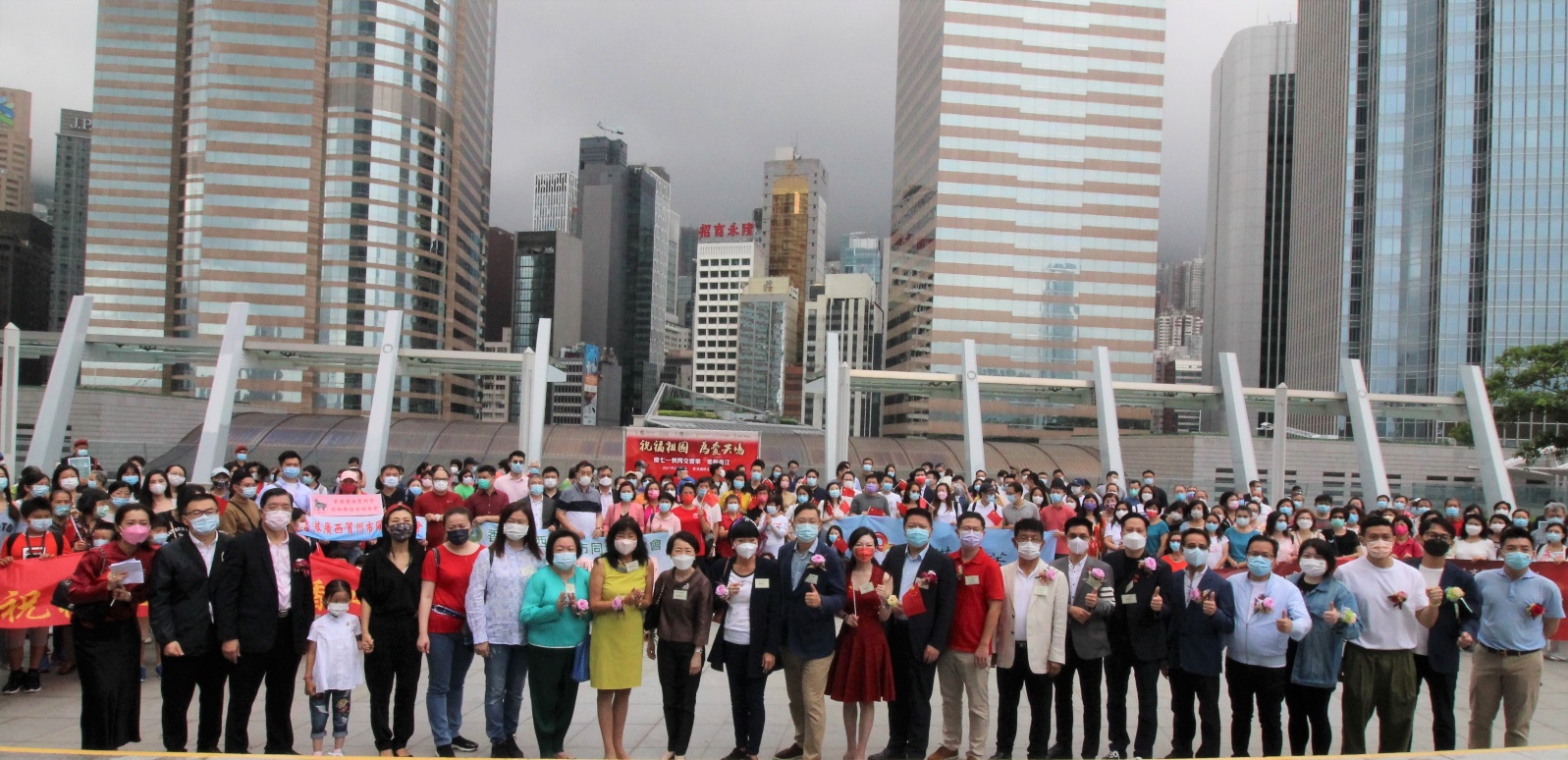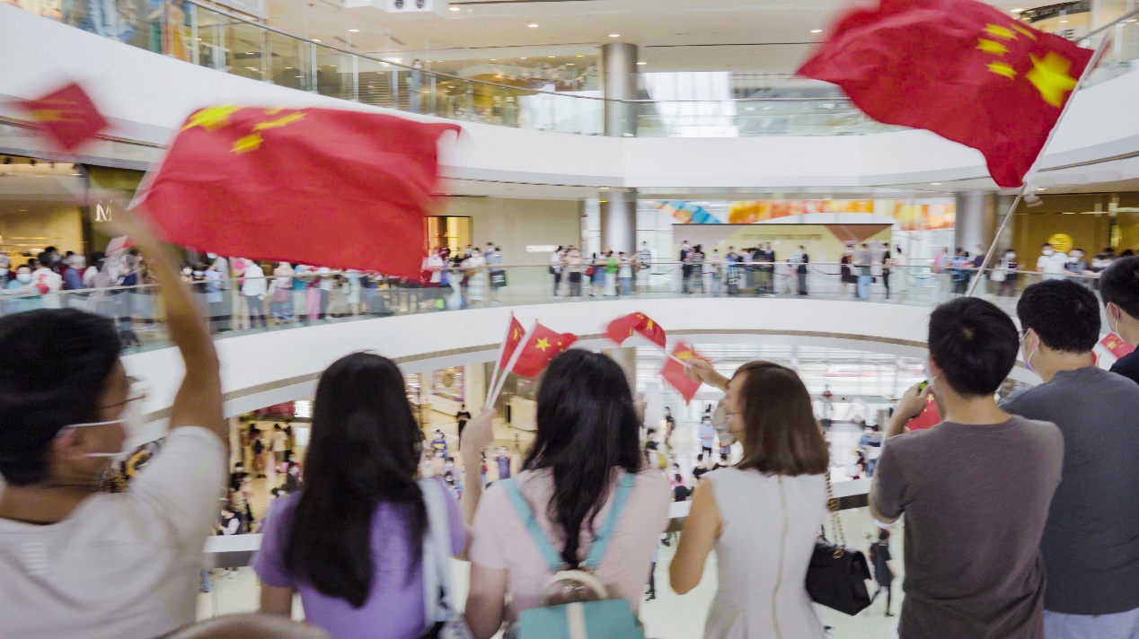 庆七一快闪交响乐活动现场香港青年飘舞红旗,祝福祖国