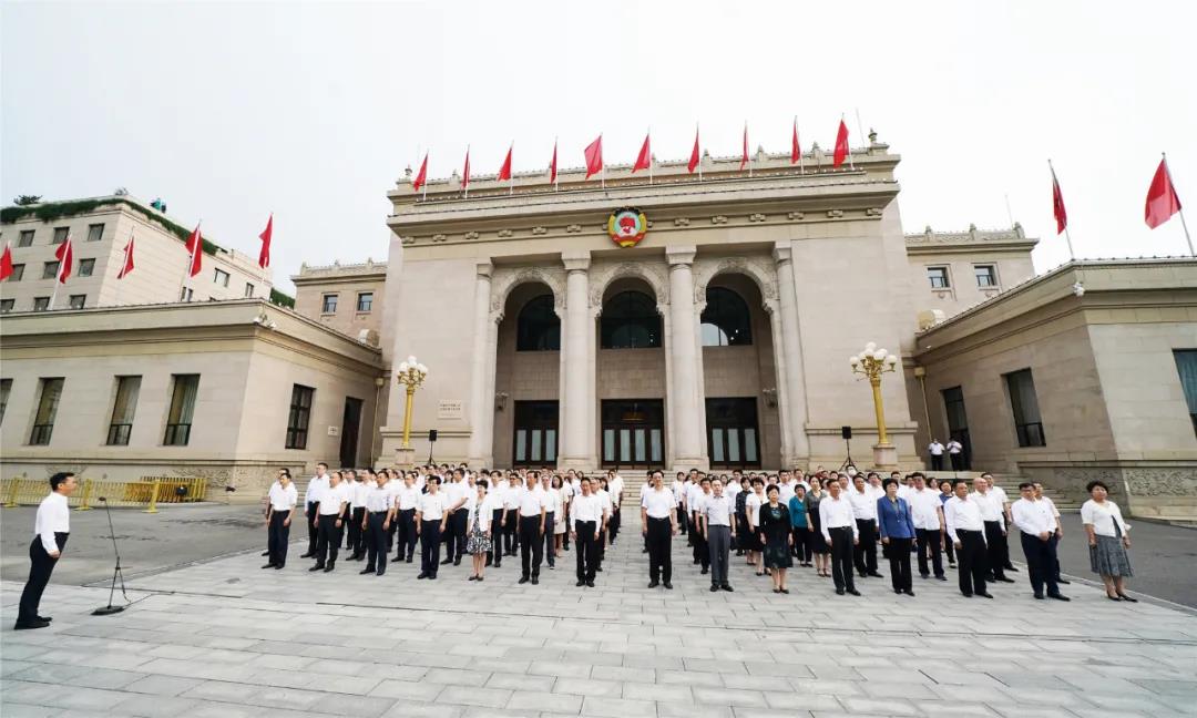 7月1日,全国政协机关在中共八大会址(全国政协礼堂)前举行升国旗仪式,庆祝中国共产党成立100周年,机关党员代表120余人参加。升旗仪式后,400余名机关党员干部集中收听收看了庆祝中国共产党成立100周年大会直播。(记者 贾宁)