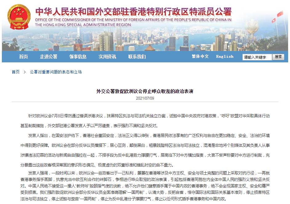 外交部驻港公署:敦促欧洲议会停止哗众取宠的政治表演