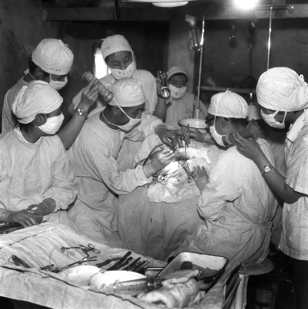▲上海医疗队用手电筒做光源为伤员做手术