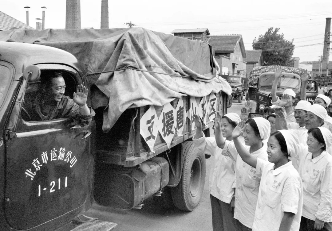 ▲北京市第一食品厂的工人为灾区群众生产了大量的面包、饼干,源源不断运往唐山地震灾区。