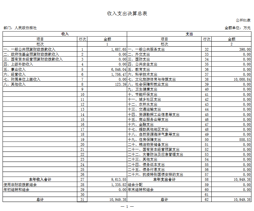 一、 收入支出决算总表