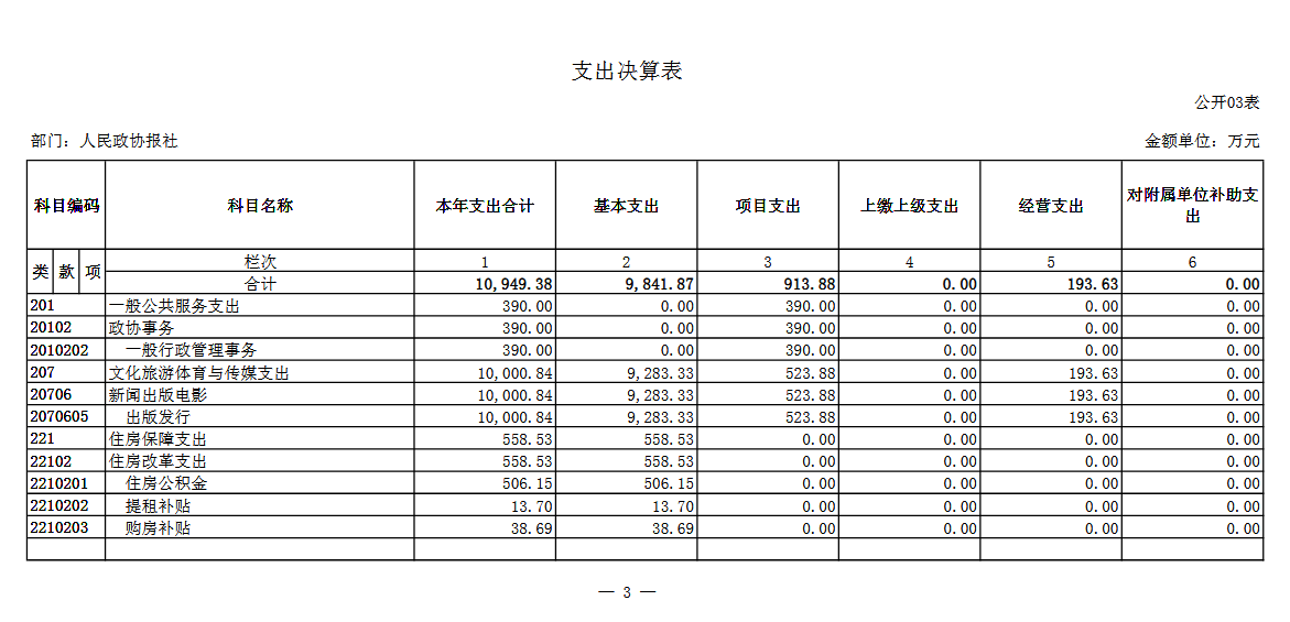 三、 支出决算表
