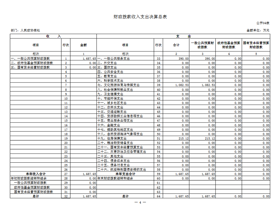 2020年度财政拨款收入总计1687.65万元,财政拨款支出总计1687.65万元。与2019年相比,收支总计各减少226.21万元,主要是减少向政协委员赠阅经费、办公大楼运行维护项目等。