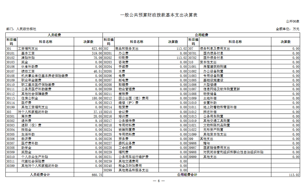 六、 一般公共预算财政拨款基本支出决算表