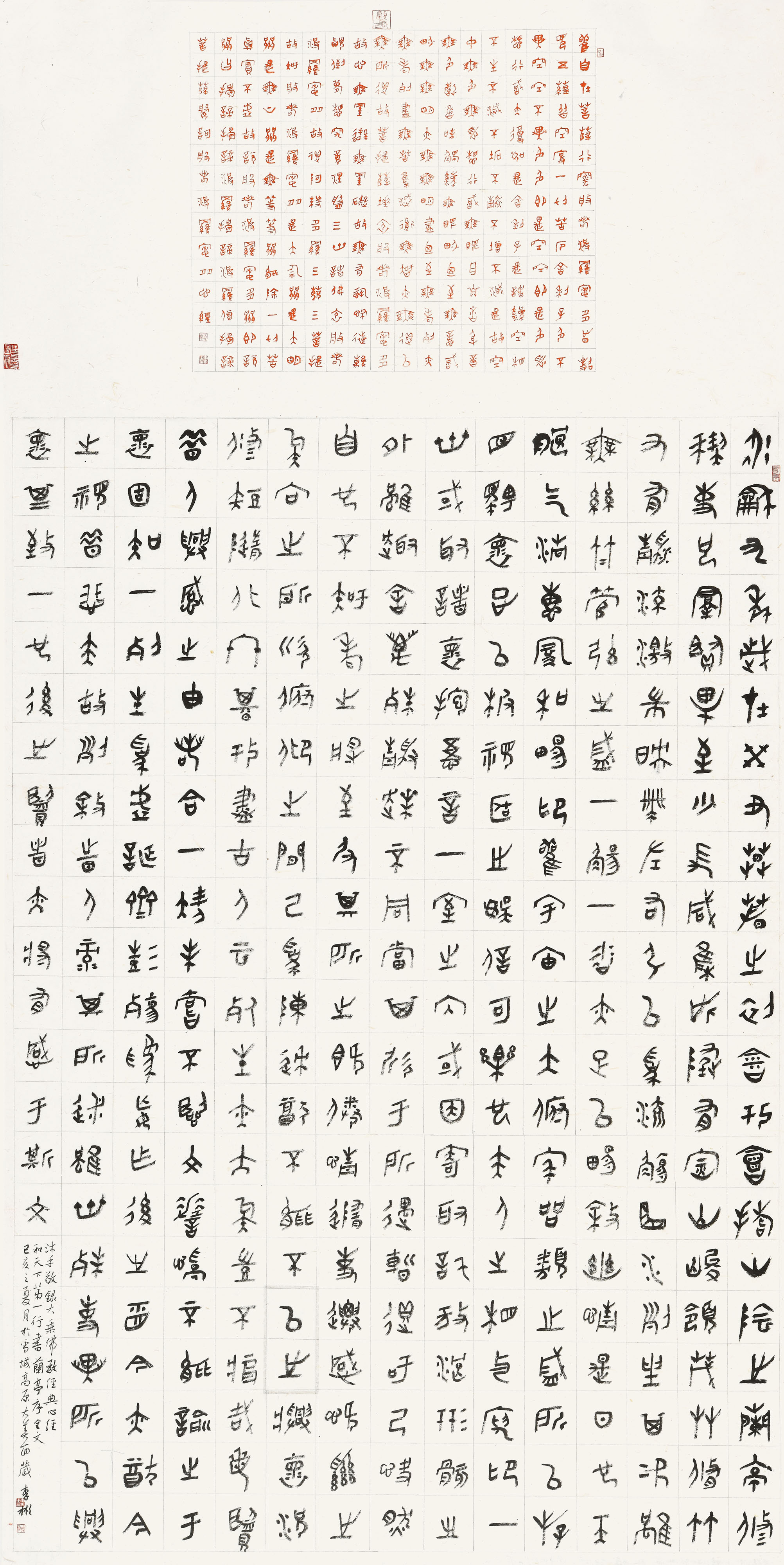此次展出李彬的公益捐赠作品100件,形式多样,内容丰富。有经典临习,有守正创新,有经典诗词,有现代词赋。真草行隶篆五体兼备。有小到一平尺的小品,有大到丈八宣纸以上的宏篇巨制;有蝇头小楷、寸楷、中楷,也有单字二米以上的大字行书、楷书、草书、隶书、篆书;有甲骨文、金文,小篆;有大草,小草、章章;有行书、行草、隶书,有藏文书法等各种书体,体现致广大而尽精微,极高明而道中庸的艺术思想。