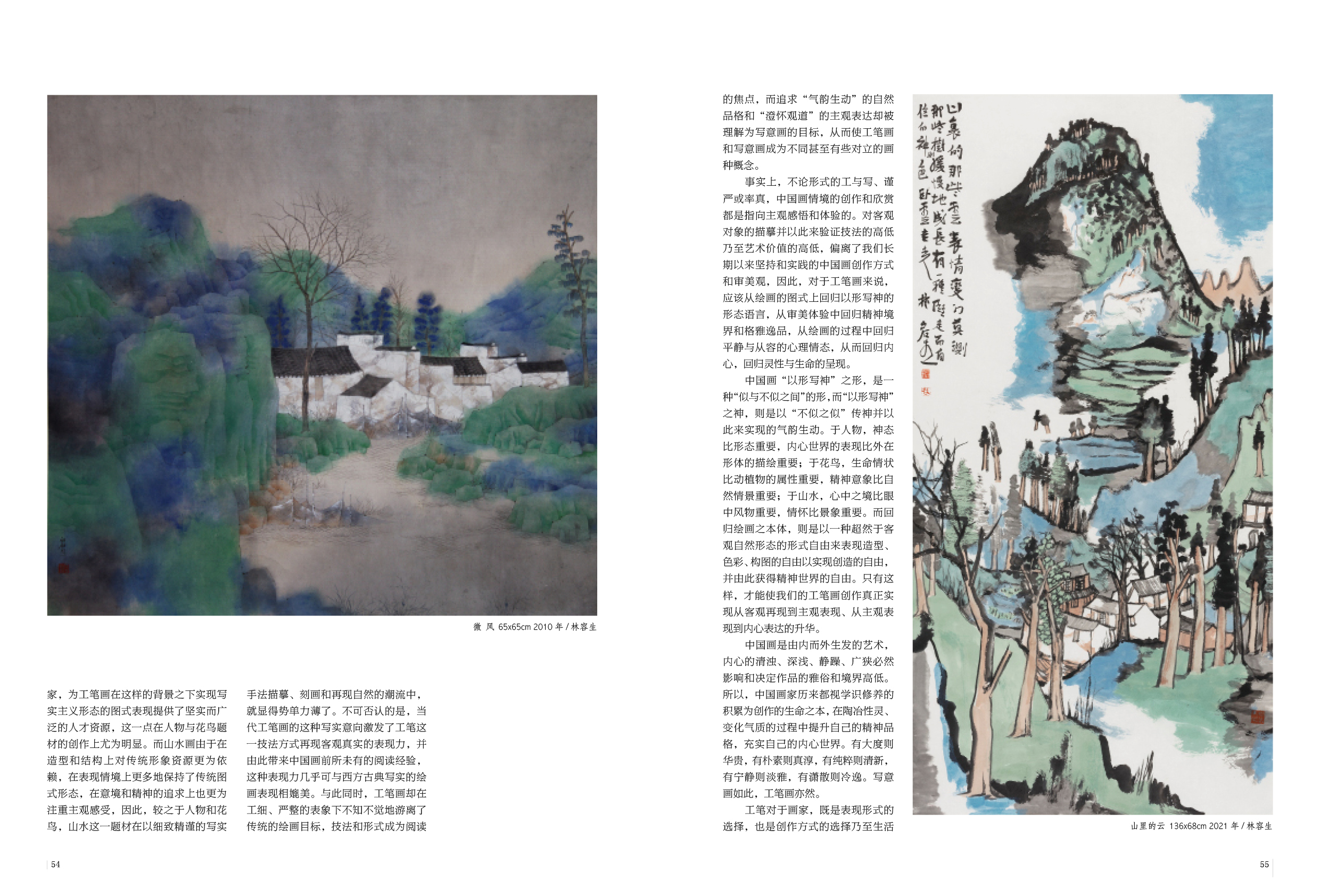 中国画被区分为“工笔画”和“写意画”,其中似乎有了雅俗之别,大致是宋元以后文人画家崇尚“逸笔草草”的笔性表现以及“不似之似”的造型观、“简淡朴素”的色彩观、“平淡天真”的意趣观使然。而20世纪初西方写实主义绘画的冲击为中国画提供了一种自然主义的审美图式,工笔画由此获得了一种形式上的优越感——中国画的媒材和表现方式同样可以挑战并实现从平面到立体、从质感到空间的客观真实再现。20世纪50年代至今,美术学院的西式造型训练成就了一批写实能力超强的新一代画家,为工笔画在这样的背景之下实现写实主义形态的图式表现提供了坚实而广泛的人才资源,这一点在人物与花鸟题材的创作上尤为明显。而山水画由于在造型和结构上对传统形象资源更为依赖,在表现情境上更多地保持了传统图式形态,在意境和精神的追求上也更为注重主观感受,因此,较之于人物和花鸟,山水这一题材在以细致精谨的写实手法描摹、刻画和再现自然的潮流中,就显得势单力薄了。不可否认的是,当代工笔画的这种写实意向激发了工笔这一技法方式再现客观真实的表现力,并由此带来中国画前所未有的阅读经验,这种表现力几乎可与西方古典写实的绘画表现相媲美。与此同时,工笔画却在工细、严整的表象下不知不觉地游离了传统的绘画目标,技法和形式成为阅读的焦点,而追求“气韵生动”的自然品格和“澄怀观道”的主观表达却被理解为写意画的目标,从而使工笔画和写意画成为不同甚至有些对立的画种概念。