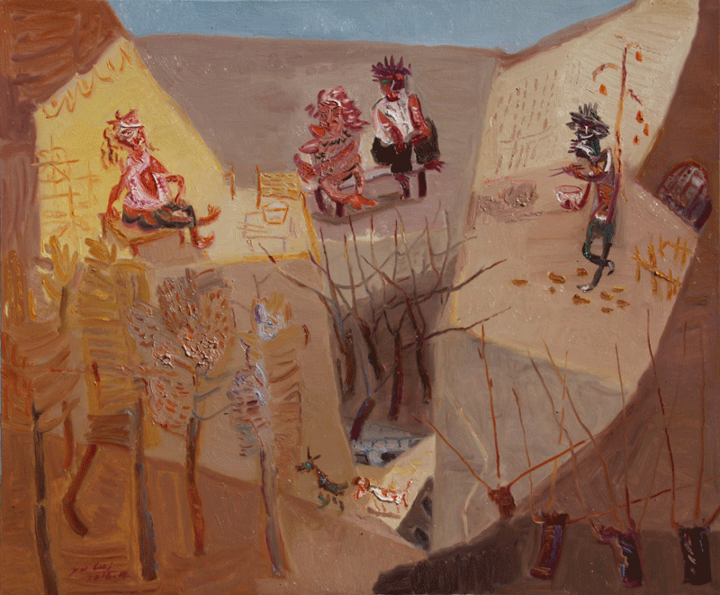 最近几年,于来的绘画更倾向于对社会景观的表现。他借鉴西方绘画中的表现主义,以抽象的艺术符号为载体,集物象、风情于一体,具有浓郁的浪漫主义特点,是真情实感的流露,也是对美好生活的向往;是生命激情的绽放,也是主观情感的形式外化。每幅作品都以隐喻的方式讲述着一个个生动有趣的小故事,是高原本真人性和日常生活的真实再现。就连作品的题目,经于来用心推敲,也朴实含蓄而意味深远。作品《挠痒痒》,一对雕塑般的男女形象充斥了整个画面,就像浸过陕北民歌的厚土。他们之间纯真质朴的爱情没有??菔?,也不需要海誓山盟,因为有风可证,有峁梁可证,有窑洞里的小狮子可证。作品《信天游》,一对骑着毛驴的男女置身于风雪肆虐过的千山万壑中,男人哼唱着高亢而奔放的信天游,女人在驴背上欢快地手舞足蹈,表现了与风同游、和土共舞的高原生活。于来以强烈而富有动感的旋律和笔触、夸张变形的客体描绘,传达了轻松乐观的主情调,讴歌了黄土高原上万物生灵坚韧的性格和顽强的生命力,这也正是他“黄土高原”系列绘画的价值所在。