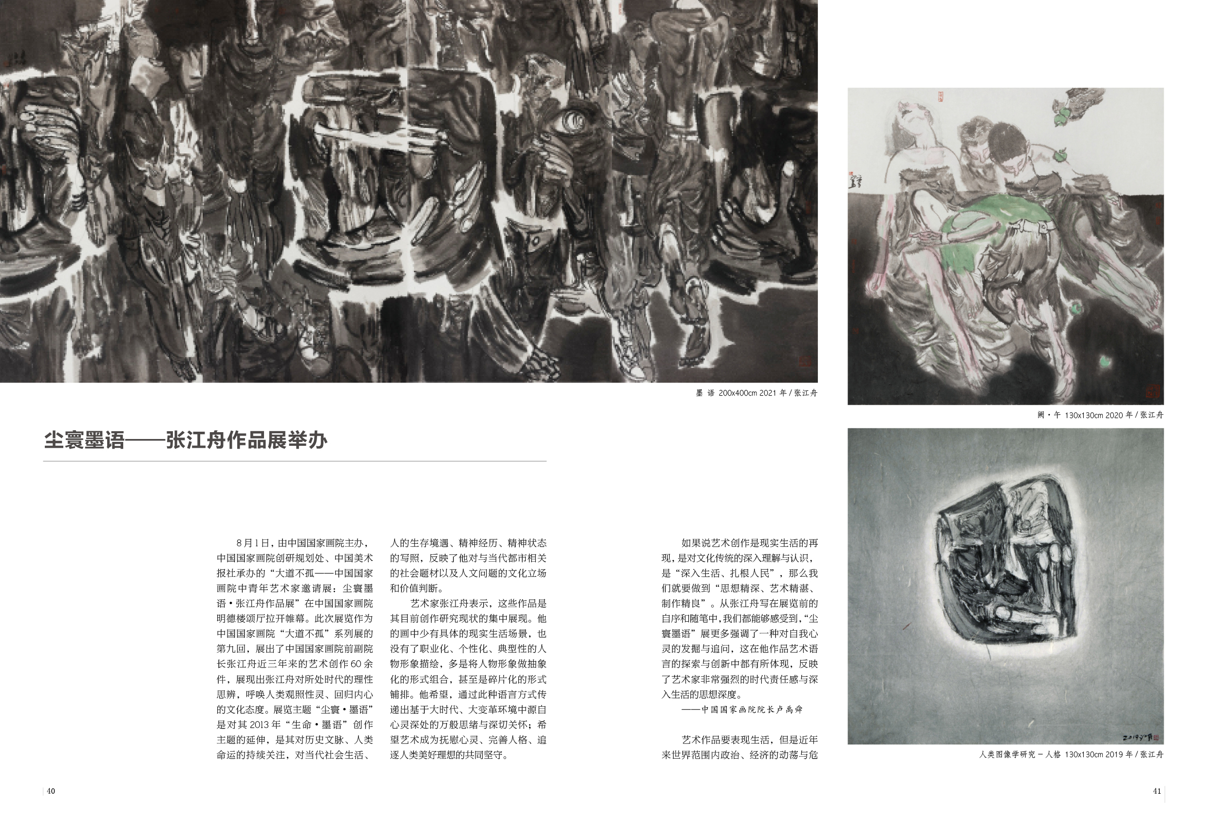 8月1日,由中国国家画院主办,中国国家画院创研规划处、中国美术报社承办的“大道不孤——中国国家画院中青年艺术家邀请展:尘寰墨语?张江舟作品展”在中国国家画院明德楼颂厅拉开帷幕。此次展览作为中国国家画院“大道不孤”系列展的第九回,展出了中国国家画院前副院长张江舟近三年来的艺术创作60余件,展现出张江舟对所处时代的理性思辨,呼唤人类观照性灵、回归内心的文化态度。展览主题“尘寰?墨语”是对其2013年“生命?墨语”创作主题的延伸,是其对历史文脉、人类命运的持续关注,对当代社会生活、人的生存境遇、精神经历、精神状态的写照,反映了他对与当代都市相关的社会题材以及人文问题的文化立场和价值判断。