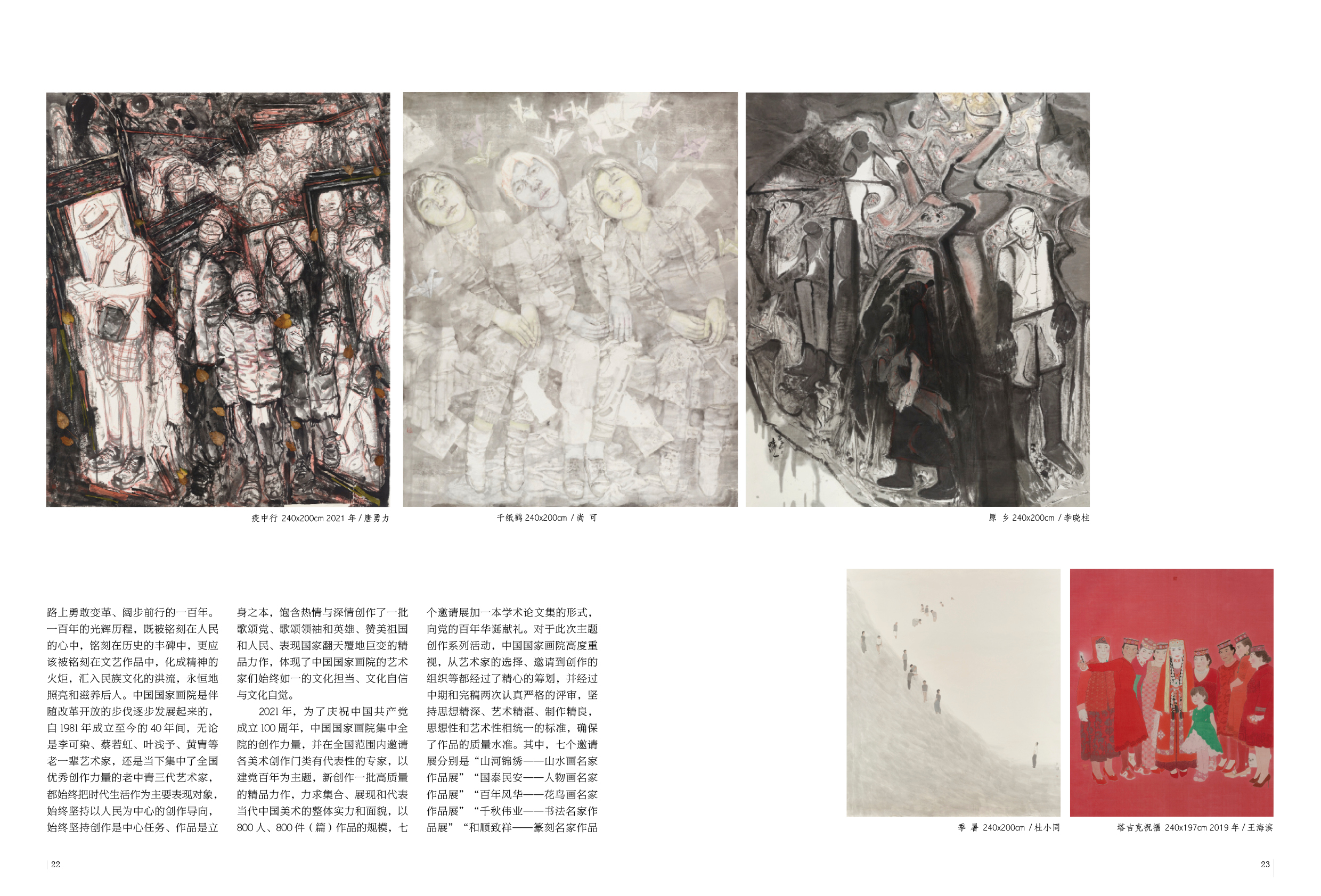 2021年,为了庆祝中国共产党成立100周年,中国国家画院集中全院的创作力量,并在全国范围内邀请各美术创作门类有代表性的专家,以建党百年为主题,新创作一批高质量的精品力作,力求集合、展现和代表当代中国美术的整体实力和面貌,以800人、800件(篇)作品的规模,七个邀请展加一本学术论文集的形式,向党的百年华诞献礼。对于此次主题创作系列活动,中国国家画院高度重视,从艺术家的选择、邀请到创作的组织等都经过了精心的筹划,并经过中期和完稿两次认真严格的评审,坚持思想精深、艺术精湛、制作精良,思想性和艺术性相统一的标准,确保了作品的质量水准。其中,七个邀请展分别是“山河锦绣——山水画名家作品展”“国泰民安——人物画名家作品展”“百年风华——花鸟画名家作品展”“千秋伟业——书法名家作品展”“和顺致祥——篆刻名家作品展”“时代画卷——油画、版画、雕塑名家作品展”“不负韶华——青年艺术家作品展”,每个展览各展出100位艺术家新创作的作品,总计700件作品。学术论文集《百家争鸣——中国共产党建党100周年新中国美术理论文集》,邀请100位理论家撰写100篇论文,深入探讨中国当代美术发展的成就、特点和得失。