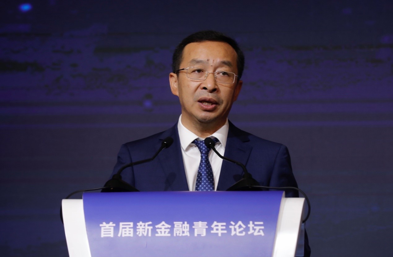2021年10月15日,首届新金融青年论坛在上海举行。图为上海市委常委、副市长吴清发表视频致辞。中新社记者 张亨伟 摄