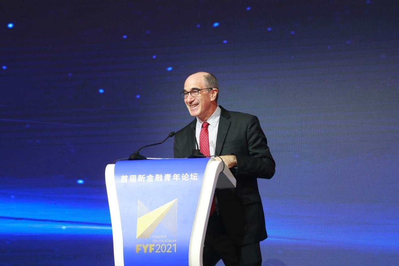 2021年10月15日,首届新金融青年论坛在上海举行。图为国际货币基金组织(IMF)驻华首席代表Steven Barnett发表寄语。中新社记者 张亨伟 摄