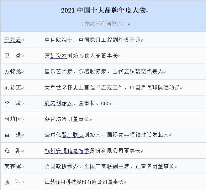 活动揭晓了“2021中国品牌人物500强”榜单,其中,任正非、钟南山、雷军等10位人物名列前十。