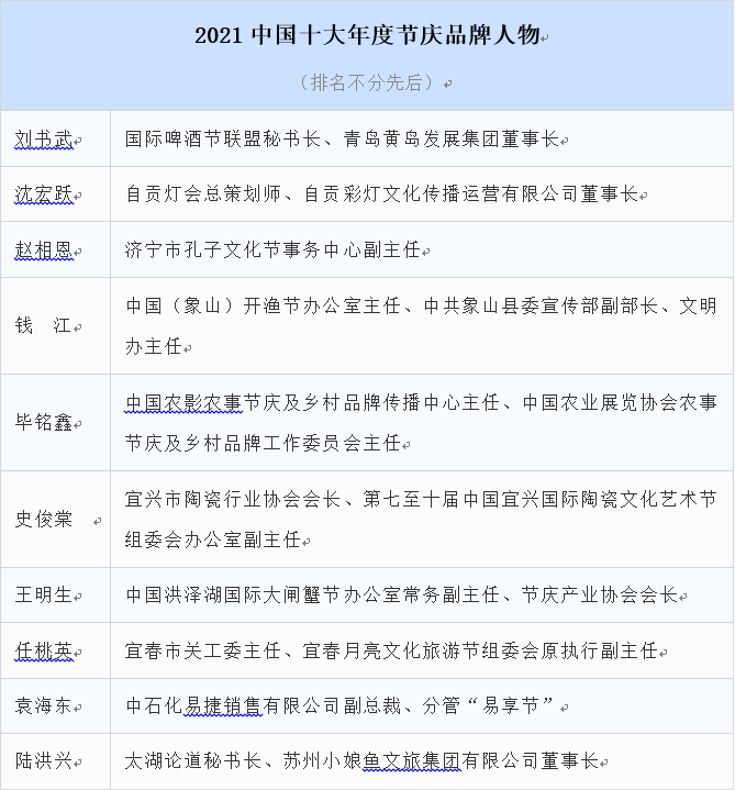 随后,《2021中国首席品牌官500强》《2021中国十大年度节庆品牌人物》等榜单也陆续发布。