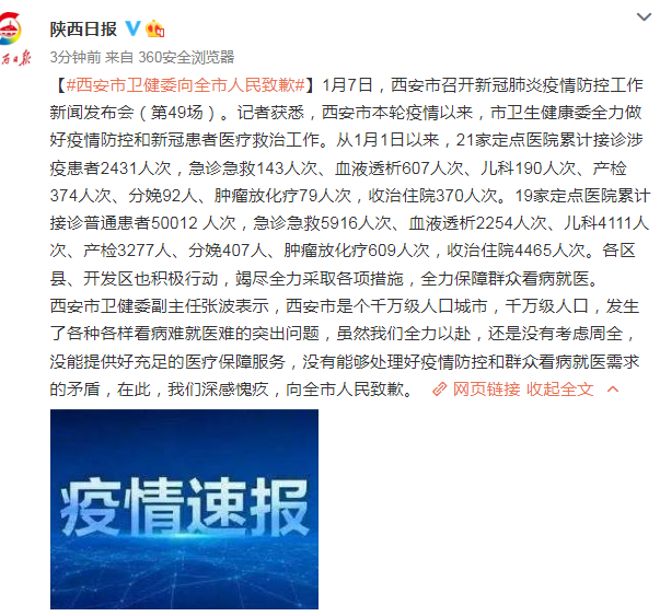 西安市卫健委副主任张波表示,西安市是个千万级人口城市,千万级人口,发生了各种各样看病难就医难的突出问题,虽然我们全力以赴,还是没有考虑周全,没能提供好充足的医疗保障服务,没有能够处理好疫情防控和群众看病就医需求的矛盾,在此,我们深感愧疚,向全市人民致歉。(陕西日报)