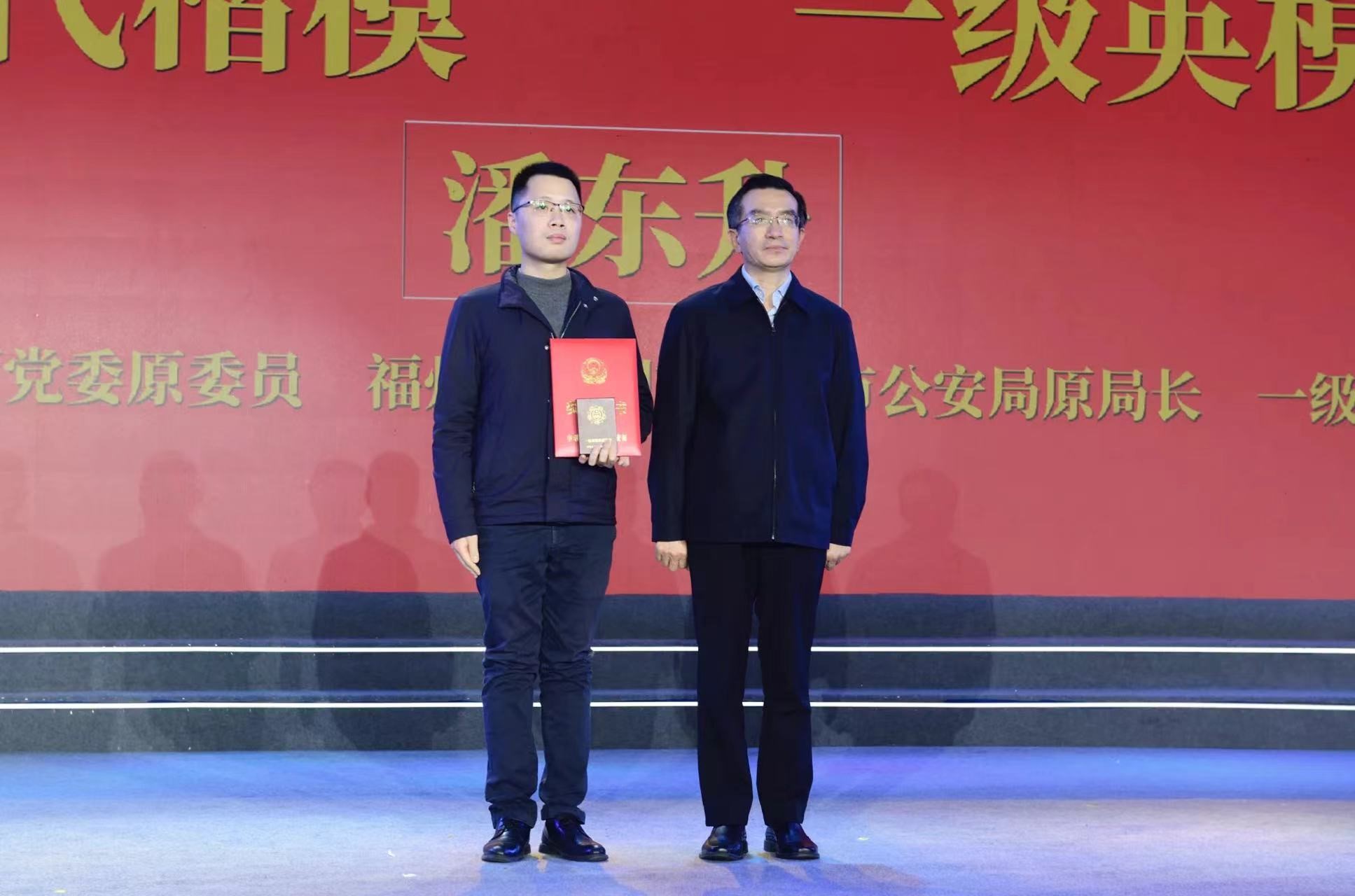 福建省委副书记、政法委书记罗东川颁发“时代楷?!迸硕救蚕低骋患队⑿勰7督闭?、证书,潘东升同志的亲属上台领奖