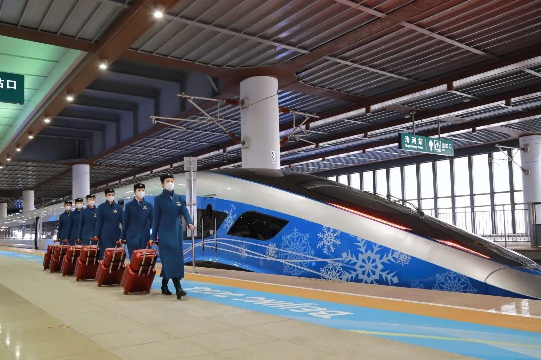 北京客运段京张高铁“雪之梦”乘务组换上象征冰雪的蓝色制服,以最饱满的精神面貌,开始冬奥列车的每一项服务工作。