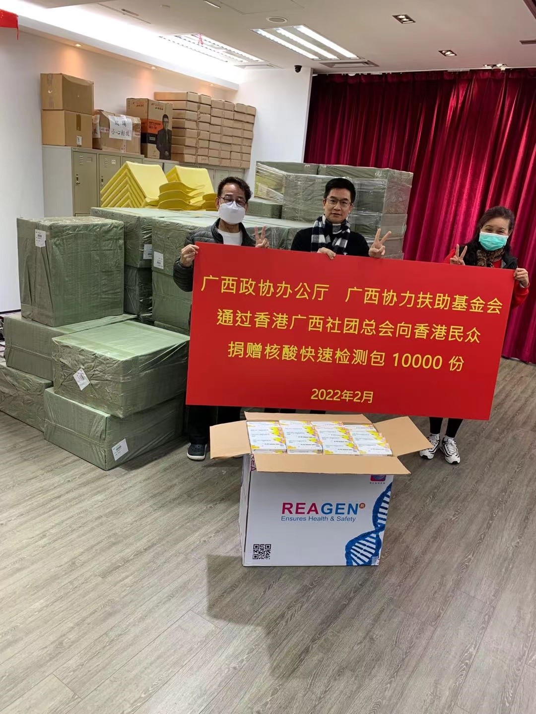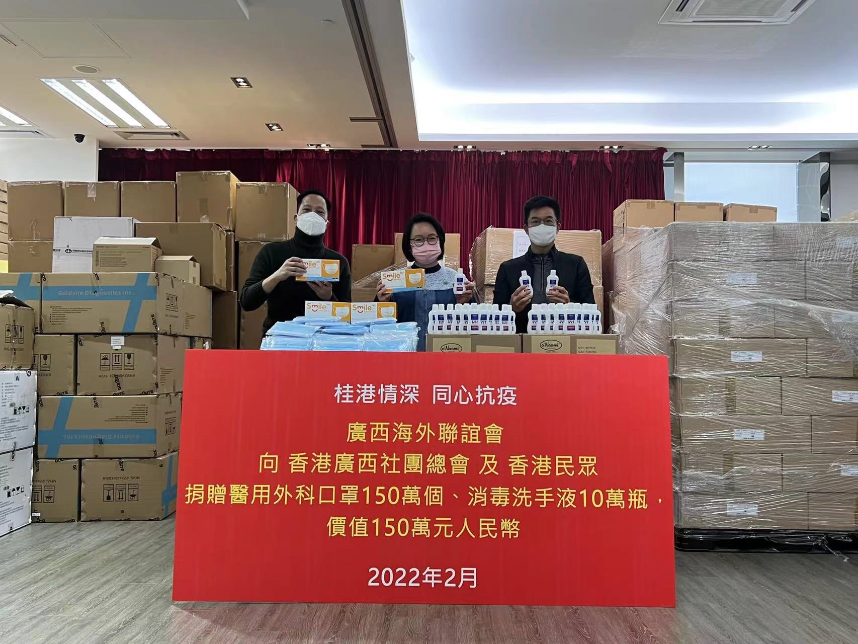据介绍,就在前两天香港广西社团总会又收到广西政协办公厅广西协力扶助基金会捐赠给香港民众的核酸快速检测包1万份,收到广西海外联谊会捐赠的医用外科口罩150万个、消毒洗手液10万瓶,总价值人民币150万元。