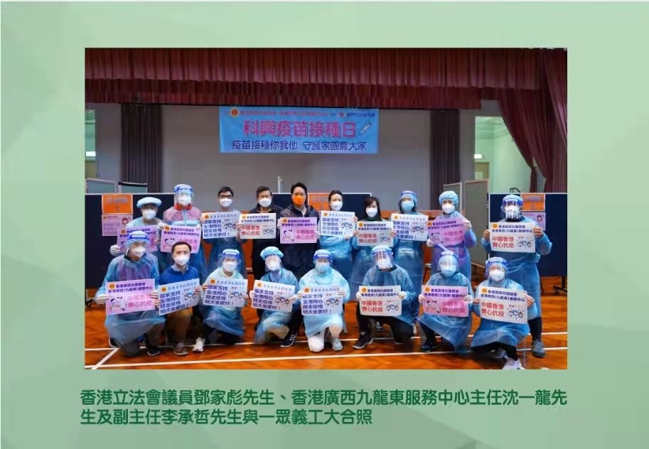 新冠肺炎疫情防控期间,广西社总一直与民政部门保持沟通,随时支持政府的抗疫工作。2月27日,广西社团总会与地区友好团体和观塘民政署合作,于蓝田东小区会堂为香港市民提供了500剂科兴疫苗接种。2月28日,善长捐赠的大批防疫物资经社团总会协调转交深水埗民政专员,转交急需的居民。