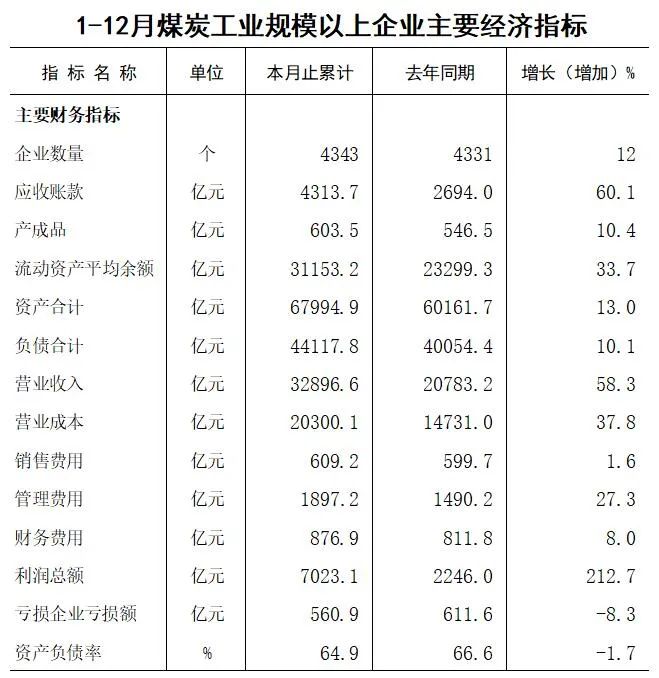 1-12月份,煤炭行业经济形势总体稳中向好,行业营收及利润继续实现双增长,亏损企业亏损额持续下降;企业资产负债率略有下降,应收账款增幅继续加大。