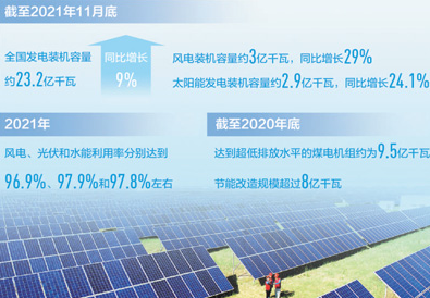 近年来,我国风电、光伏等可再生能源装机规模持续扩大。截至2021年11月底,全国发电装机容量约23.2亿千瓦,同比增长9%。其中,风电装机容量约3亿千瓦,同比增长29%;太阳能发电装机容量约2.9亿千瓦,同比增长24.1%。