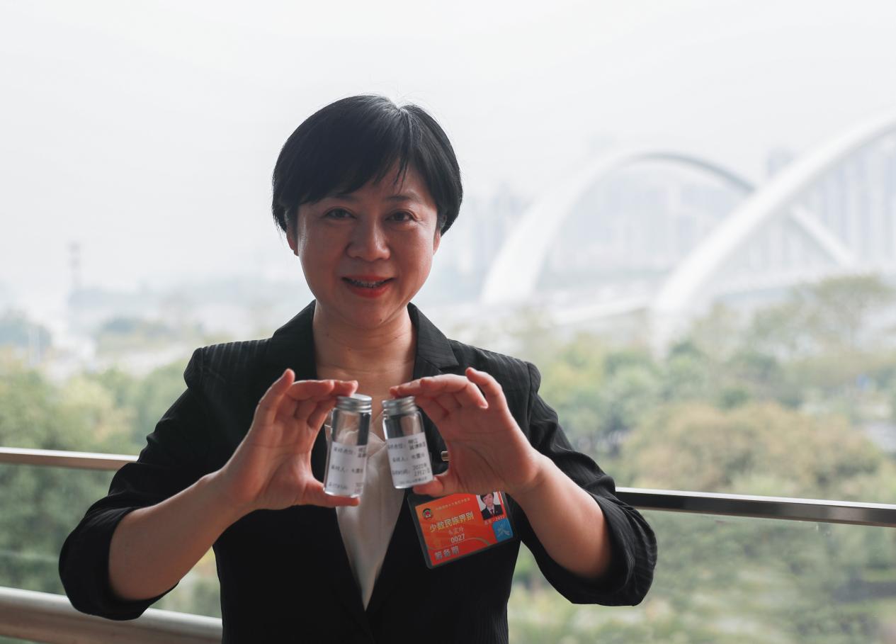 全国政协委员、广西壮族自治区柳州市人民检察院副检察长韦震玲向记者展示她要带到全国两会的柳江水 覃文宇 摄