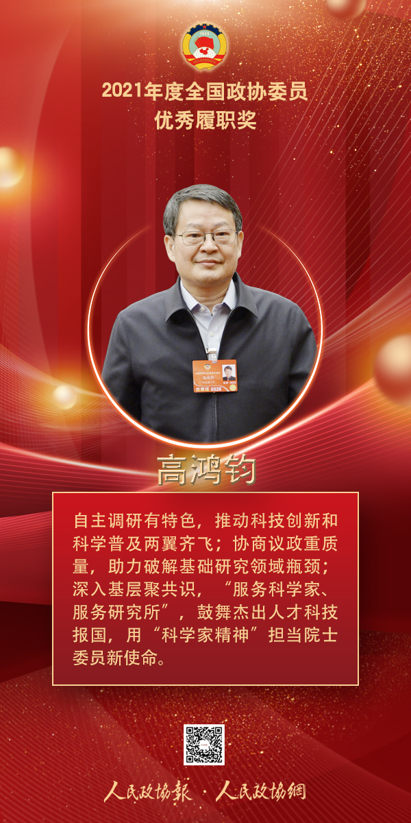 获奖感言 作为一名无党派人士界的政协委员,由衷地感谢全国政协授予我2021年度优秀履职奖。我将以此次获奖为履职新起点,按照习近平总书记对政协委员提出的“坚持为国履职、为民尽责的情怀,把事业放在心上,把责任扛在肩上”的要求,胸怀“国之大者”,持续强化责任担当,不断提升履职能力,充分发挥自己在科技创新一线工作的优势,团结广大科技工作者,凝聚智慧和力量,为人民政协更好地发挥专门协商机构作用作出更多贡献,为国家实现高水平科技自立自强努力奋斗。
