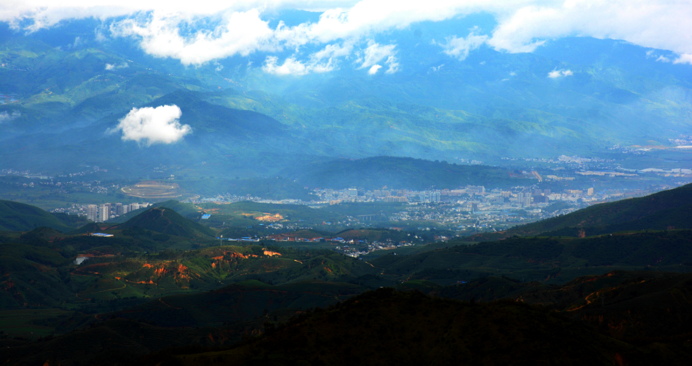 云南省临沧市云县的徐霞客游线标志地:(1)县城象山南麓(2)观音阁(今圣教寺)(3)砥柱桥遗址(4)“龙砂”“虎砂”(今旗山)(5)“钦命云州”新城遗址(含明代古城墙遗迹)(6)马鞍山。图为马鞍山(今旗山)远景。