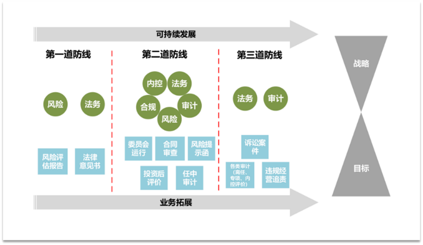 中国纸业的“大风控”体系,是“五位一体”贯穿“三道防线”的风险管控体系(见下图)。第一道防线由公司业务部门(采购、销售等)及相关岗位人员组成,对业务所发生的风险负主体责任,负责执行各项具体的风险合规管理制度,完善各业务条线操作流程,在业务前端识别、评估、应对、监控和报告各自职责范围内的各类风险。但同时,将法务、风险前置到第一道防线,以法律意见书和风险评估报告为抓手,提供给经营管理及战略发展相关意见,提前预判风险。第二道防线由风险管理委员会、合规管理委员会、风险合规部门组成,是风险合规管理的监督与组织协调者,负责统筹协调相关职能部门、分支机构管理合规风险事宜,制定各类管理制度、标准等。此时,法务、合规、风险、内控、审计均置于第二道防线,以委员会运行、合同审查、风险提示函、投资后评价、任中审计为抓手,协助一线核心业务部门进行风险管控。第三道防线由审计委员会和审计部门组成,负责对企业合规管理体系运行情况和运行效果、合规管理政策的执行情况进行检查、评估。同时,法务也被置于第三道风险,以诉讼案件管理为抓手,与以各类审计(离任、专项、内控评价等)及违规经营追责为抓手的审计一同,对风险合规管理进行监督检查,并跟进事项整改,形成闭环管控。