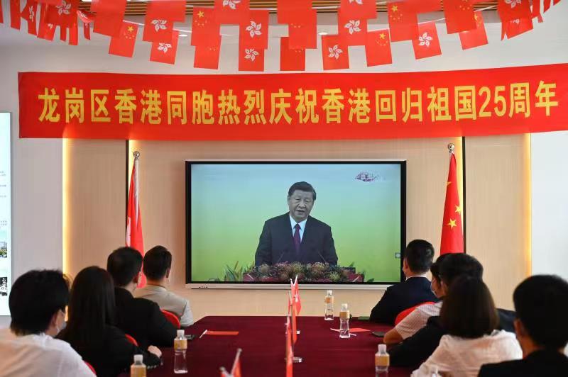 “习近平主席特别关心香港青年人,强调‘青年兴,则香港兴;青年发展,则香港发展;青年有未来,则香港有未来。’香港回归祖国25年来,成功实践了‘一国两制、港人治港’,相信在新一届特别行政区政府的领导下,香港一定会展现新的气象,创造新的辉煌?!痹诹谄胶歉旨诺橙悍裰行暮?0多位香港同胞一同收看庆典的区政协委员、香港潮汕客属联谊总会执行会董吕子康和大家介绍了自己15年在深圳工作生活的心路历程。他说,作为区政协港澳青年委员,必须有勇气、骨气、底气,努力成为香港青年的学习典范,引领香港年轻一代培养爱国情怀,带领香港青年特别是学生来深圳看看,一起参与大湾区建设,为推动深港合作、粤港澳大湾区贡献青年力量!