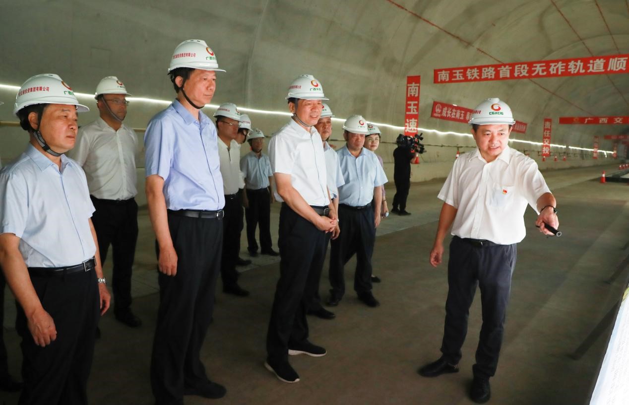 孙大伟一行首先来到广西市市通高铁工程重大项目——新建南宁至玉林城际铁路项目良睦隧道出口,认真听取项目规划、施工组织、工程进度情况汇报,实地查看无砟轨道试验段铺筑等情况,现场了解项目存在困难和问题。