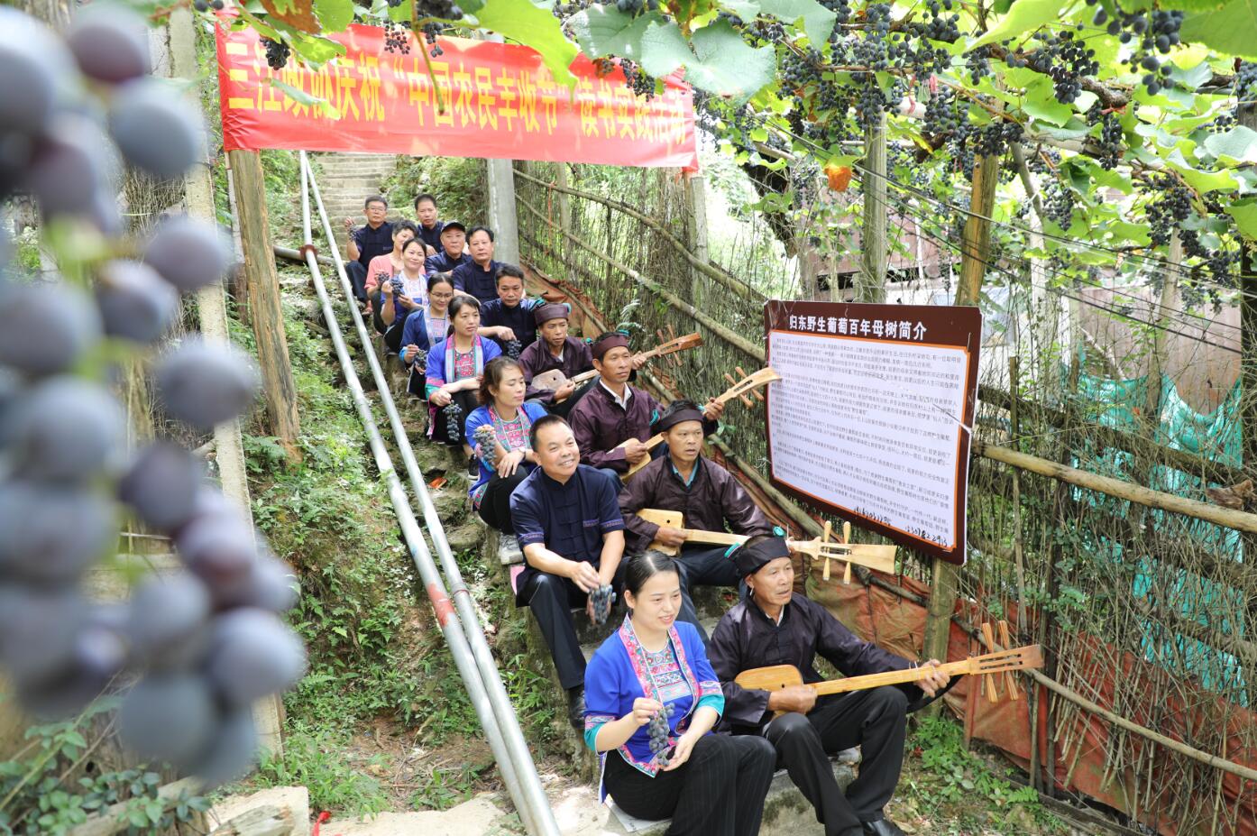 8月26日,广西壮族自治区柳州市三江侗族自治县同乐苗族乡归东村百年野生母树葡萄架下,三江政协“书香政协”庆?!芭┟穹崾战凇倍潦槭导疃鹑冉?,县政协委员和机关干部高声朗读乡村振兴产业发展有关内容,并通过琵琶弹唱丰富读书活动,助力乡村振兴。梁克川 摄