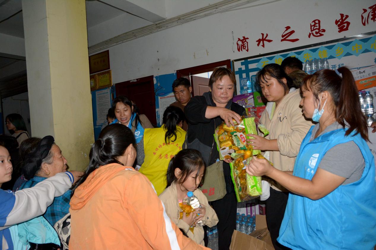 石棉县政协委员刘晓红(黑衣)正在向安置点受灾群众发放救灾物资。(石棉县政协供图)