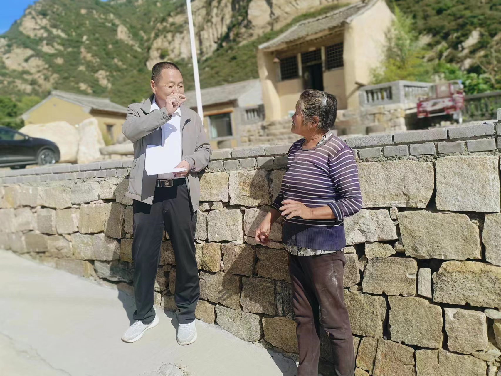 顾瑞利(左)在入户调研,了解村民基本情况。